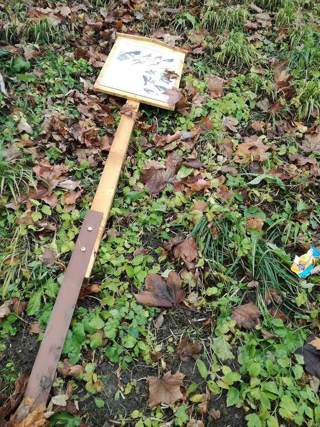 Po opravě a znovu instalaci informační cedule ve vztahu k budované síti budek pro ptáky a netopýry tentokráte cedule vydržela na svém místě pouze víkend a byla opět poničena neznámým „hrdinou“, který si přidal i několik odpadkových košů. Na základě těchto skutečností bylo podáno oznámení o přestupku na osobu neznámého pachatele. K pravidelnému ničení této cedule a odpadkových košů si každý rozumný člověk udělá obrázek sám.