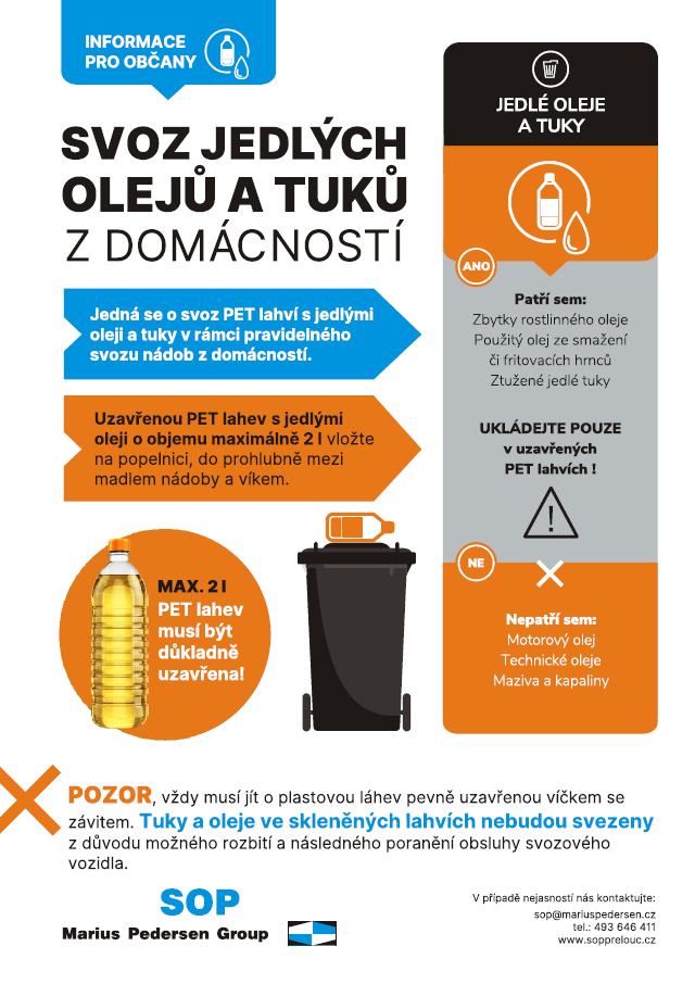 Pro lepší názornost a připomenutí připravila svozová společnost SOP a.s. leták s informací o svozu jedlých olejů a tuků z domácností v Přelouči a jak správně naložit s použitými tuky a oleji, které často končí chybně v kanalizaci nebo směsném odpadu. Ke stažení viz odkaz níže.