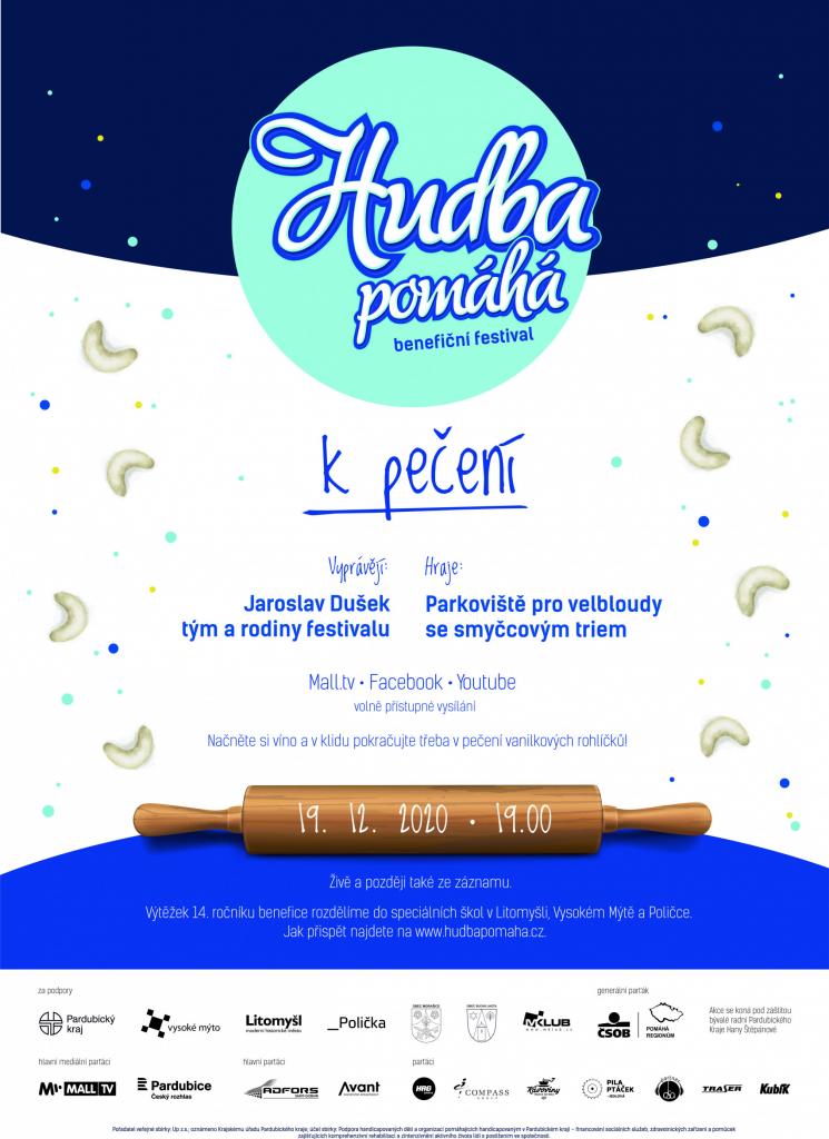 Organizátoři benefičního festivalu Hudba pomáhá nabízí i vám všem možnost připojit se k letošnímu ročníku. Ačkoliv letos nebylo možné uspořádat klasický ročník s vánočními a klubovými koncerty, nakonec se podařilo vymyslet alternativu s názvem "Hudba pomáhá - k pečení", kterou si lidé budou moci vychutnat z pohodlí domova. Na sobotu 19. prosince v 19 hodin je připravený volně přístupný večerní pořad, kde vystoupí kapela Parkoviště pro velbloudy, Jaroslav Dušek a spousta dalších hostů, přičemž výtěžek následně poputuje do speciálních škol v Litomyšli, Poličce a Vysokém Mýtě. Ačkoliv se tato akce přímo netýká našeho města, předáváme tuto informaci i sem k nám do Přelouče. Bližší informace naleznete v příloze této zprávy.